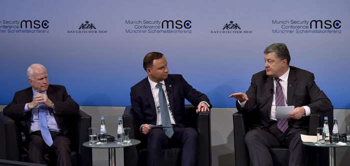 У п’ятницю, 17 лютого, президент України Петро Порошенко прибув з робочим візитом до Федеративної Республіки Німеччина. Там він узяв участь у 53-й Мюнхенській конференції з питань безпеки. Зокрема, глава української держави виголосив промову у рамках дискусії «Майбутнє Заходу: падіння чи повернення? (The Future of the West: Downfall or Comeback?)».