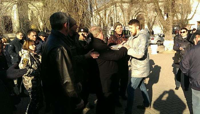 В кінці акції до натовпу прихильників сепаратизму на Донбасі підійшов високий молодий чоловік і почав кричати, що Росія винна у війні на Сході України. Повідомляється, що хтось із мітингувальників тут же дав йому ляпаса. Розлючені учасники акції заволали, що потрібно «прибрати цього провокатора». До чоловіка підійшли російські правоохоронці і вивели його під руки з натовпу, після чого посадили в свій автозак.