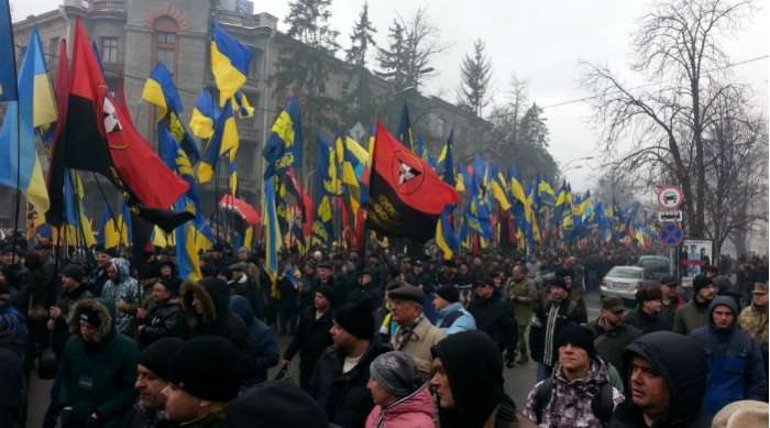 Активісти від національного корпусу АЗОВ, «Правого сектору» та ВО «Свобода» тримають у руках свої прапори. Як зауважили організатори цього дійства, у марші орієнтовно візьме участь близько 10 тисяч українців.