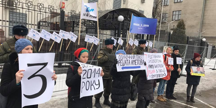 У п’ятницю, 24 лютого, під посольством Росії відбулася акція організації «Крим SOS». Активісти нагадали, що в окупованому Криму ще 17 активістів чи простих людей зникли невідомо де.