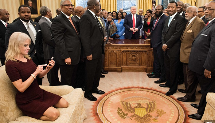 Келліан Конвей, радник Дональда Трампа, вирішила зайняти для себе найзручнішу позицію під час зустрічі президента з керівниками історично чорних коледжів та університетів. Так, вона стала навколішки на дивані.