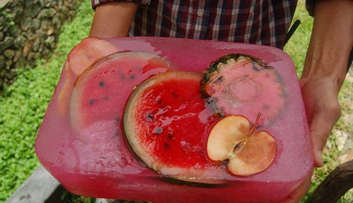На выбор предлагают йогурт, фрукты и сироп или рыбу – все в виде льда. Над домами животных также установили навесы – чтобы уберечь их от солнца.