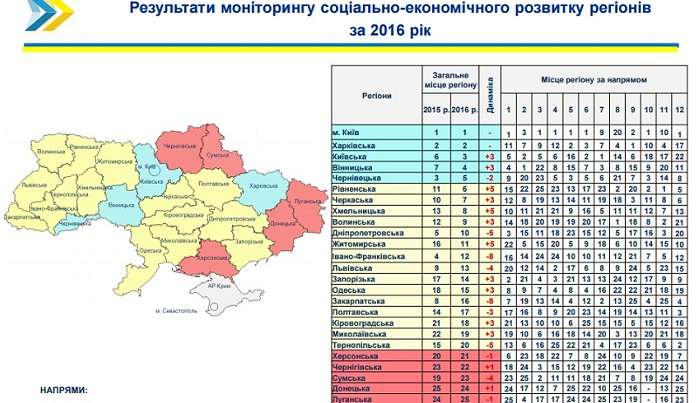 Київ, Харківська, Київська, Вінницька і Чернівецька області очолили рейтинг соціально-економічного розвитку регіонів за 2016 р який розробило Міністерство регіонального розвитку, будівництва та житлово-комунального господарства.