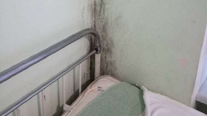 На фото видно, що палата, в якої колись був зроблений ремонт та вставлені металопластикові вікна, зараз в жахливому стані – по стінах та стелі розповзлася чорна цвіль.