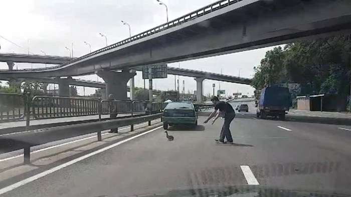 В сети набирает популярность видео, как водители на киевской трассе остановили свои автомобили, чтобы позволить уткам перейти дорогу.