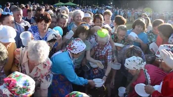 Праздник включает в себя процедуру освящения обрядовой каши и урожая. Когда кашу начали раздавать, пенсионерки, которые заранее выстроились в очередь, стали толкаться, кричать и выхватывать тарелки друг у друга. При этом одна из женщин попыталась успокоить толпу: «Люди, вас снимают, какие вы дикие, вы что!».