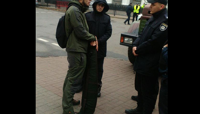 Сьогодні, 21 жовтня, правоохоронці Києва помітили підозрілого чоловіка, який прямував до українського парламенту, де зараз проходить акція протесту. З собою у нього виявили гвинтівку з оптичним прицілом, пістолет та ніж.