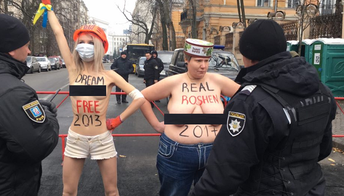 Акція протесту тривала близько хвилини. Учасниць протесту одразу затримали силовики. Варто зазначити, що це вже третя акція протесту збоку Femen за останній час. Раніше у столиці активістка підпалила декорацію біля входу у фірмовий магазин цукерок Порошенка. Крім того, на своїй грудях вона написала «Імпічмент або цукерки». Друга акція відбулась у Вінниці, де ще одна активістка підпалила декоративний трамвай, що теж прикрашав магазин президента Roshen. Останній протест був присвячений черговому викриттю офшорних схем українського лідера.