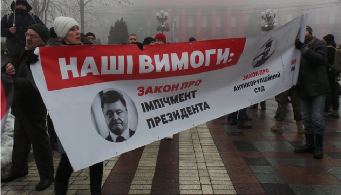 Націоналісти, прихильники Саакашвілі та інші активісти, які виступають за імпічмент Порошенка, зібрались у Києві. Тут вони очікують на президента та вже відтіснили поліцейських.