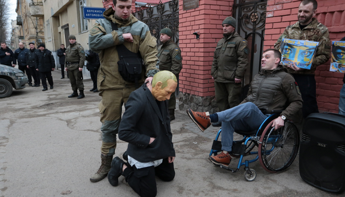 Как отмечается, «Путин» также был одет в памперс. Кроме того, другой участник акции в кмуфляжний форме «заставил» мужчину в маске президента России размахивать белым флагом. В сети появилось фото с места происшествия, на котором видно, что к акции присоединился доброволец в инвалидной коляске. Последний пытался ударить «Путина» ногой.