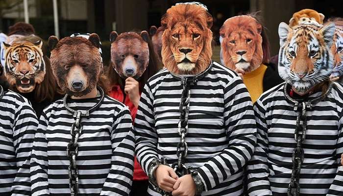 У Страсбурзі, що на сході Франції, пройшла яскрава акція протесту. Небайдужі до долі тварин люди переодяглись у тюремні костюми. Завершили образ маски тварин та ланцюги, зафіксовані на шиї та руках активістів.