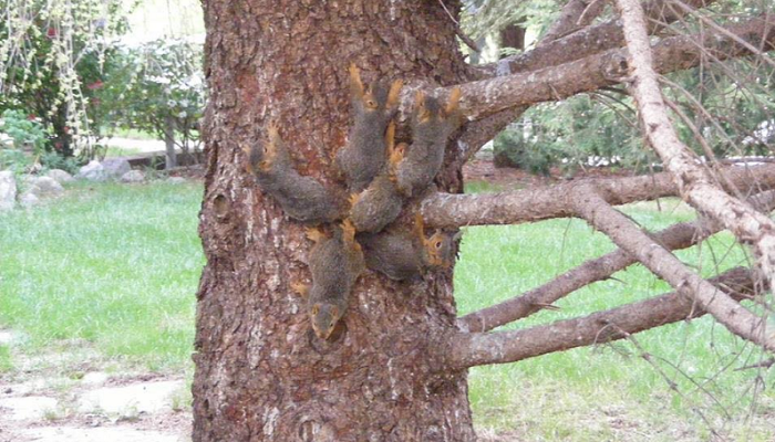 Житель американського штату Небраска повідомив зоозахисників про незвичний інцидент, який трапився у його дворі. Крейг Луттман помітив, що на одному дереві скупчилось 6 невеликих білок, які заплутались у власних хвостах. В результаті тварини не могли нормально рухатись і кожна намагалась перетягнути компанію в свою сторону.