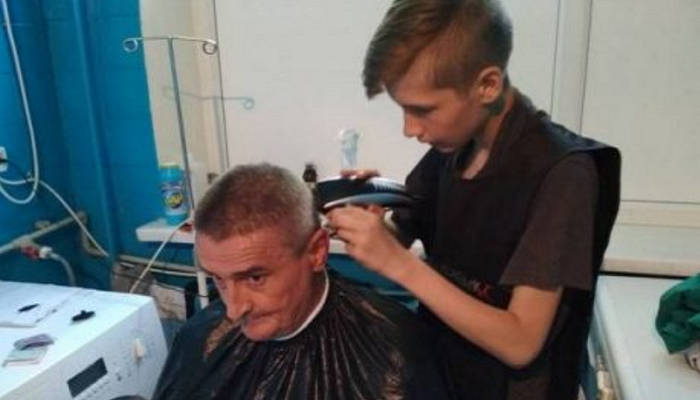 Український користувач соцмережі Facebook Тарас Шеремета розповів про інцидент, який трапився у військовому госпіталі міста Маріуполя. За його словами, учень машинобудівного ліцею №4 Микита Накалюжний вирішив надати всім пораненим бійцям ЗСУ послуги перукаря.