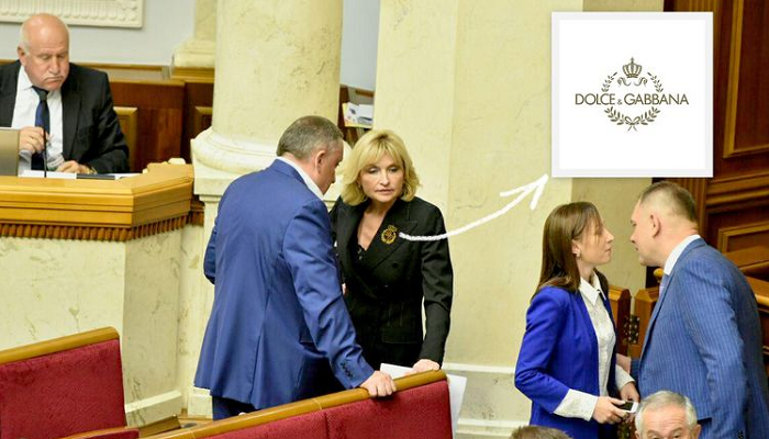 Нардеп от Блока Петра Порошенко Ирина Луценко выделилась во время голосования за создание антикоррупционного суда в Украине. Для события она выбрала черный пиджак от Dolce & Gabbana с вышитым золотыми нитями логотипом. Как известно, одежда известного бренда не из дешевых. Стоимость такого пиджака $2895, что эквивалентно около 76 000.