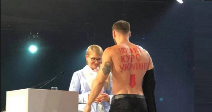 Во время выступления Юлии Тимошенко на всеукраинском форуме «Новый курс Украины» к ней подошел мужчина. Последний показал политику торс и массивную спину, на которой графически было изображено, который именно «курс Украины».