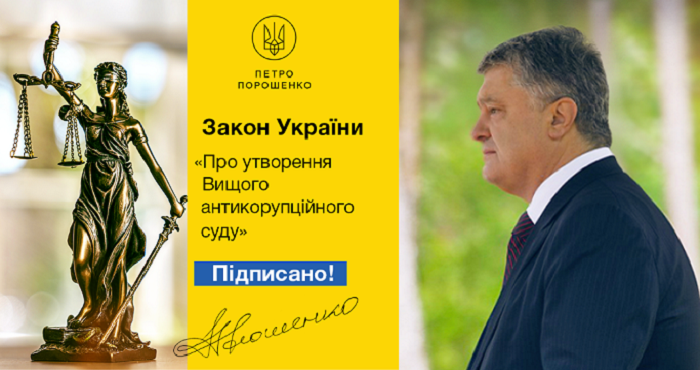 Сьогодні, 26 червня, президент України Петро Порошенко своїм підписом надав чинності Закону «Про утворення Вищого антикорупційного суду». Подія відбулась в Інституту міжнародних відносин КНУ ім. Шевченка. Так, президент підписав документ у присутності випускників.