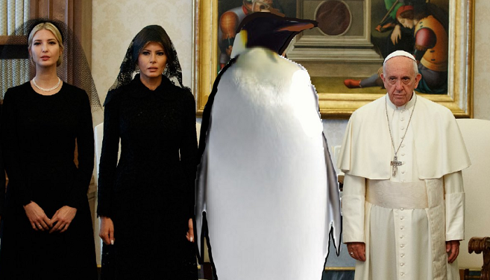 Користувачі Мережі влаштували новий флешмоб. Так, вони почали ділитися колажами, на яких на фото з Дональдом Трампом замість американського лідера красується пінгвін. Ініціатором флешмобу став відомий письменник та режисер Армандо Янунчі.