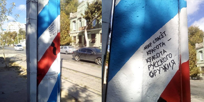 В Одессе были замечены провокационные граффити. На Французском бульваре неизвестные изобразили на нескольких электроопорах флаг РФ. Рисунок дополнили антиукраинскими надписями. В частности, «Мир спасет красота – красота русского оружия».