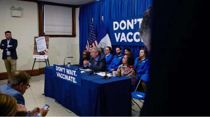 Мэр города Билл Де Блазио заявил, что в области здравоохранения наблюдается чрезвычайная ситуация. Он предупредил, что невыполнение обязательных прививок приведет к штрафу в размере 1000 долларов США.