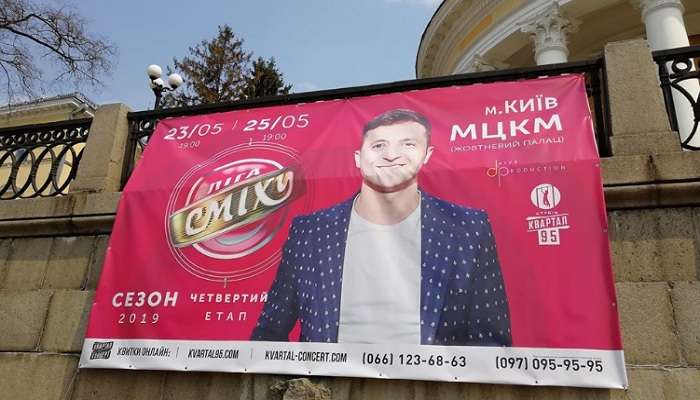 В столице Украины, городе Киеве, появились афиши юмористического проекта «Лига смеха», ведущим которого, как известно, является Владимир Зеленский. Так, его лицо можно увидеть на баннере. Однако, будет ли новоиспеченный политик подрабатывать в роли ведущего, пока неизвестно.
