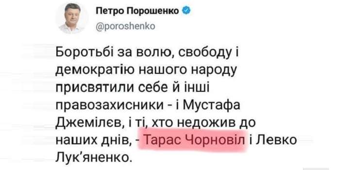 На официальной странице Петра Порошенко в Twitter появилось сообщение, вызвавшее бурные эмоции у интернет-сообщества. Так, пока еще действующий лидер вспомнил Тараса Черновола, однако, очевидно, что в сообщении речь должна была идти речь о его отце Вячеславе Чорноволе.