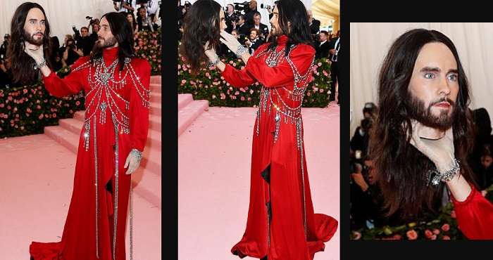 Джаред Лето виділився з-поміж екстравагантних зірок на балу Met Gala. 47-річний музикант прийшов у червоній шовковій сукні та тримав у руках реалістичну копію своєї голови.
