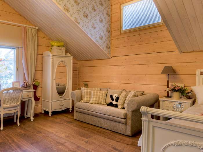 Что относится к внутреннему наполнению жилья, то здесь встречается минимальная отделка стен, чтобы сохранить дух деревянных домов. При желании владелец дома может полностью переделать под квартиру, где отделка абсолютно без дерева. Последний вариант станет возможным только в том случае, если прошла усадка дома. Покрашенные и отштукатуренные стены с обоями, и ровные стены будут цельными только в том случае, если дом перестанет «дышать» и «ходить».