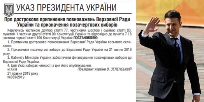 «Руководствуясь частью второй статьи 77, частями шестой и седьмой статьи 83, пунктом 1 части второй статьи 90 Конституции Украины и в соответствии с пунктами 7 и 8 части первой статьи 106 Конституции Украины постановляю: 1. Прекратить досрочно полномочия Верховной Рады Украины восьмого созыва. 2. Назначить внеочередные выборы в Верховную Раду Украины на 21 июля 2019 года. 3. Кабинету Министров Украины обеспечить финансирование внеочередных выборов в Верховную Раду Украины», – говорится в документе.