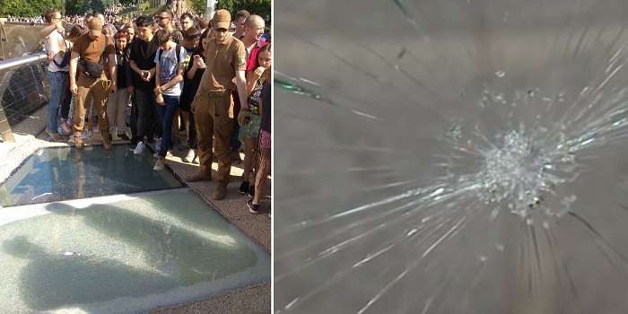Так, одну з скляних панелей оточили представники Муніципальної варти, щоб відвідувачі до неї не наближалися. Віталій Кличко вже відреагував на інцидент.
