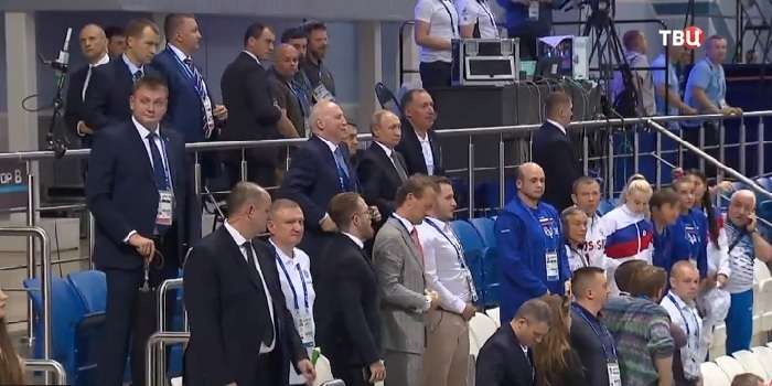 Однак, цікаве зовсім не це. Під час нагородження українця Олександра Хижняка, переможця боксерських змагань у ваговій категорії до 75 кілограм, було включено гімн України. Усі присутні, в тому числі Путін, прослухали його стоячи.