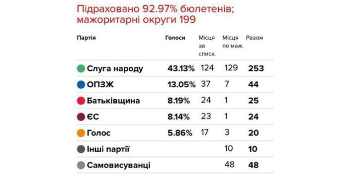 По состоянию на 23 июля ЦИК обработала 93% бюллетеней. Об этом на своей странице в соцсети надписал политик Александр Онищенко. Так, партия Владимира Зеленского «Слуга народа» набирает 43,13% голосов, что равно 253 мандатам.