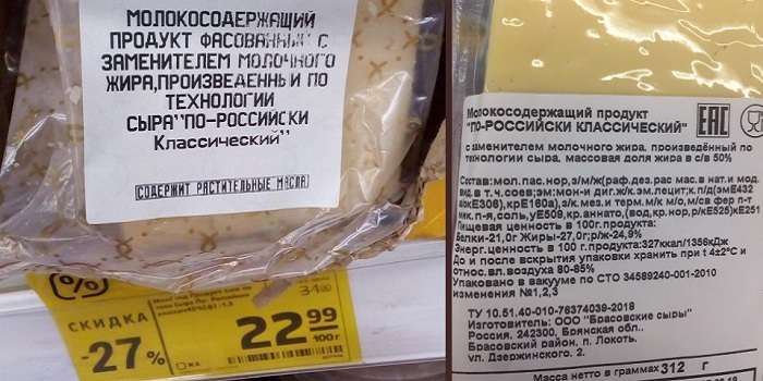 Пользовательница соцсети Твиттер под ником «Белокурая Жози» представила на своей странице фото молокосодержащего продукта, внешне похожего на сыр. На нем красовалась маркировка «Молокосодержащий продукт, фасованный с заменителем молочного жира, изготовленный по технологии сыра «по-российски классический», содержит растительные масла».