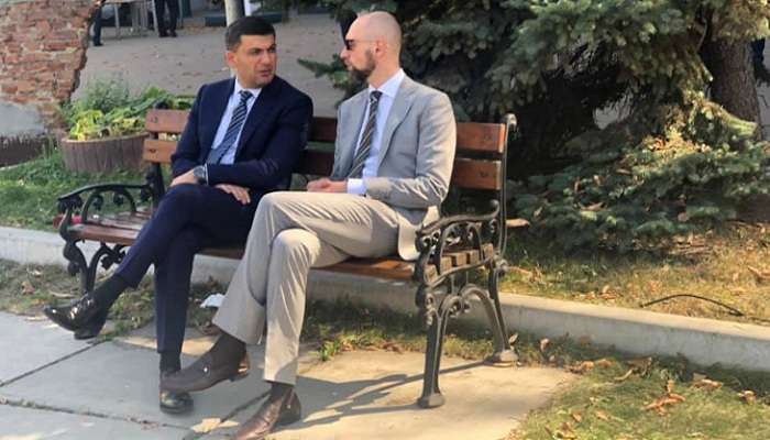 Микола Азаров запропонував інтернет-спільноті вгадати, про що можуть розмовляти Володимир Гройсман та Арсеній Яценюк, сидячі на лаві.