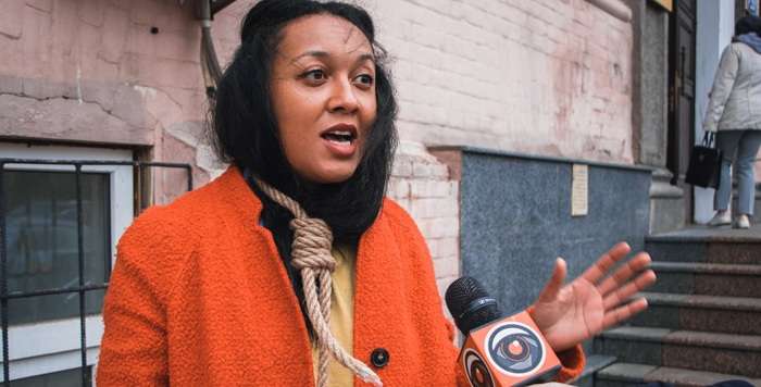 Анжелина Диаш решила провести одиночную акцию протеста. Так, она появилась под стенами Печерского райсуда с петлей.