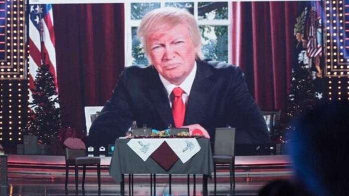 Так, у номері актор, який грає Трампа, телефонує Володимиру Зеленському по Skype та вітає з Новим роком. Крім того, герой Трамп заявляє, що після їх останньої зустрічі справи у нього йдуть не дуже. Він також просить українського президента позичити йому поліграф для майбутнього допиту в конгресі в справі про імпічмент.