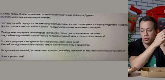 В Інструкції зазначено наступне: «Колеги, прошу звернути увагу на випуск нового шоу про їжу від Олексія Дурнєва! Ми є потенційними учасниками. Тому прохання передати усім адміністраторам Доставки, а також операторам у кол-центр наступну інформацію: при отриманні замовлення від імені Олексій – передати бланк замовлення менеджеру піцерії! Менеджер пі церії в свою чергу контролює замовлення, приготування и склад замовлення. Кожна страва повинна бути виконана по технологічній карті і відповідати вазі! Це наша репутація і ми повинні бути професіоналами своєї справи! Кожне замовлення повинно відповідати зазначеній вазі і складу інгредієнтів. У разі неякісної доставки замовлення для шоу – особисто розбиратимусь в усіх нюансах та каратиму винуватців!».