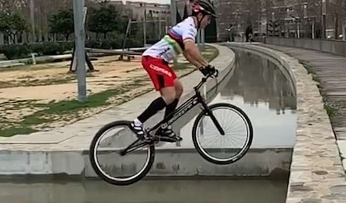Сергі Ллонгюрас показав, як за допомогою свого велосипеда він може перестрибувати через широкі канали.