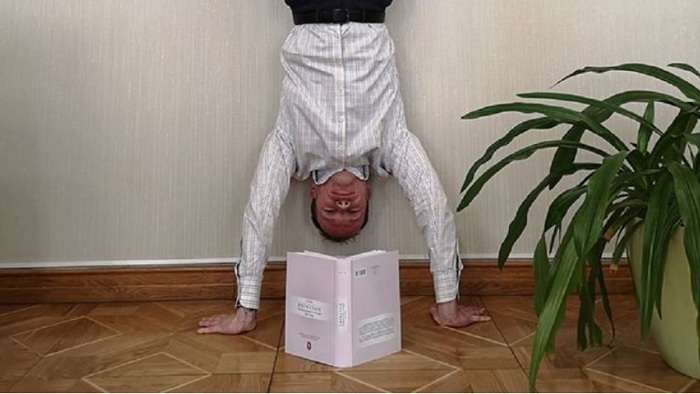Міністр юстиції Денис Малюська оприлюднив на своїй сторінці у соцмережі незвичне фото. Так, він показав, як читає, стоячи на руках вниз головою.