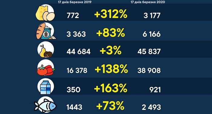 Для прикладу 35-річний Нефьодов зазначив, що за 17 днів березня в Україну завезли 3177 тонн молочних продуктів, яєць, меду на 13,6 млн доларів. Крім того, 6166 тонн продуктів із зернових культур на суму 12,3 млн доларів. Фрукти та горіхи 45 837 тонн на суму 33,9 млн доларів. 38 908 тонн овочів на 20,4 млн доларів.