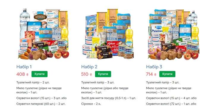 У набори входить різна кількість приблизно однакових продуктів та товарів. Мова йде про туалетний папір, фрукти, овочі, бакалію, молочні продукти та інше. Однак українцям також треба буде заплатити за доставку додому. Це буде коштувати 60-75 грн.