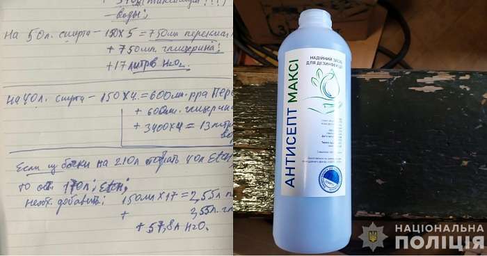 «На місце події прибула слідчо-оперативна група. При проведенні обшуку поліцейські виявили пластикові цистерни з різними рідинами, обладнання для виготовлення дезінфікуючого засобу, різні ємності і етикетки на розфасовану готову продукцію. На момент виявлення підпільного цеху там знаходилося двоє людей. Їх доставили до відділку», – зазначили у прес-службі МВС.