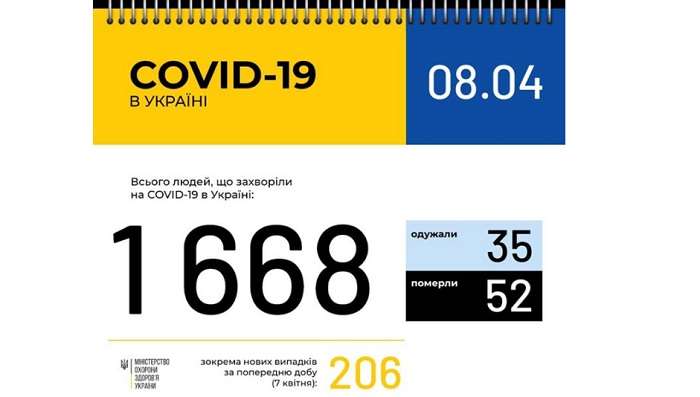 Сегодня, 8 апреля, стало известно, что в Украине 1668 случаев инфицирования COVID-19. Об этом сообщили в пресс-службе Минздрава. Из этого числа 52 летальных случаев, 35 пациентов выздоровели.