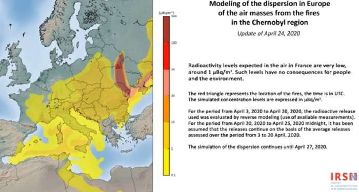 Ємельяненко також представив проекцію диму чорнобильських пожеж, яку надав Центр ядерної безпеки Франції. На ній видно, що чорнобильські пожежі щедро направили світу хмари диму.