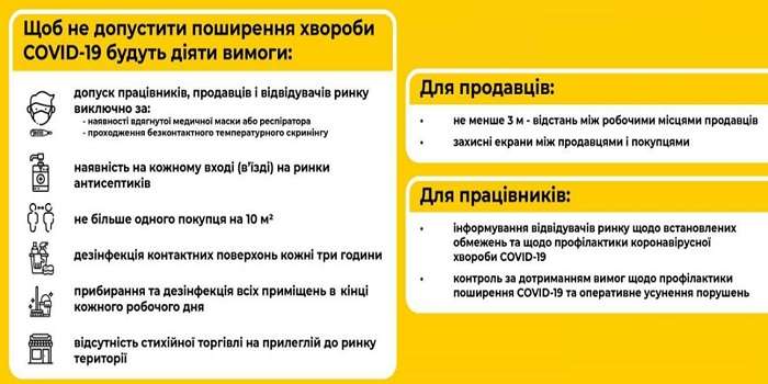 Тим не менше, ринки працюватимуть виключно за умови дотримання певних правил. Інфографіку з правилами представили на сайті МОЗ.
