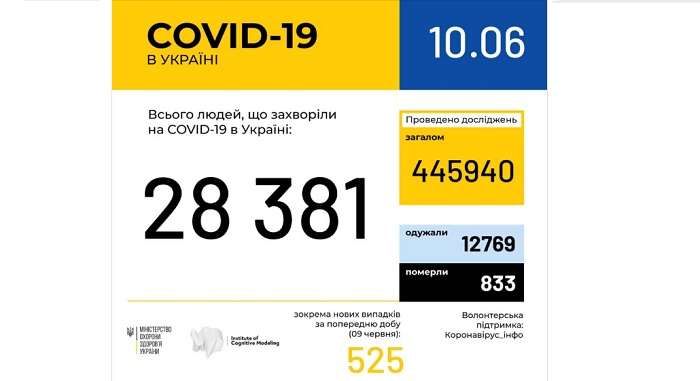 Сегодня, 10 июня, в пресс-службе Минздрава представили свежую статистику по распространению коронавируса в Украине. Так, за последние сутки количество новых выявленных больных возросло на 525 человек. Теперь общее количество больных составляет 28381 человек. К сожалению, из них 833 пациента умерли. Также 12769 человек выздоровели.