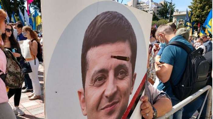 Вони взяли з собою плакати із зображенням чинного президента Володимира Зеленського з патроном в лобі.