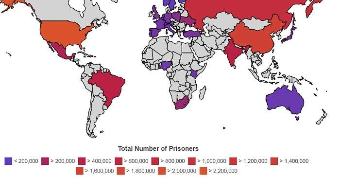 США є світовим лідером за показником позбавлення волі. Близько 25% усього тюремного населення світу знаходиться саме в США. Наразі тут перебуває понад 2,1 млн ув’язнених. Коефіцієнт ув’язнених, тобто кількість ув’язнених на 100 000 осіб, становить – 737.
