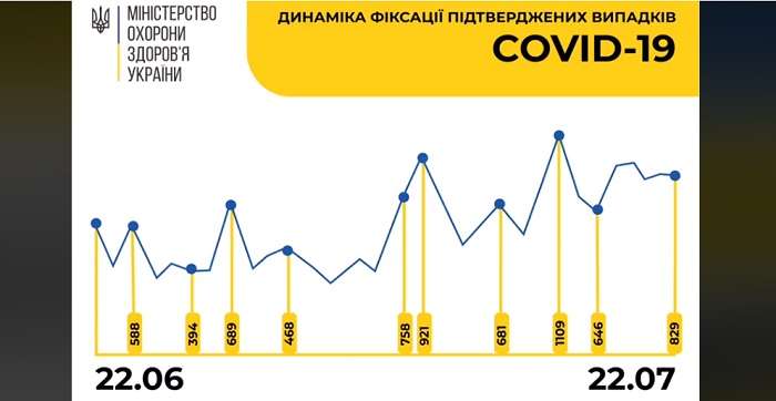 По данным пресс-службы Минздрава, в Украине зафиксировано 829 новых случаев COVID-19. Общее количество больных на 22 июля составляет 60995 человек. Из них, как уверяют в Минздраве, 1534 летальных случая. Также 33172 человека выздоровели.