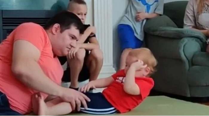 У свої неповні два роки він показав, як вміло качає прес.