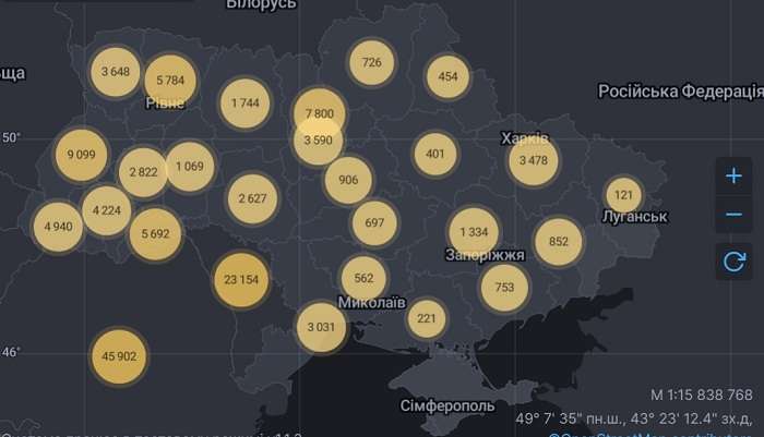 Кількість випадків захворювання на коронавірус в інших областях в РНБО представили у вигляді інтерактивної карти.
